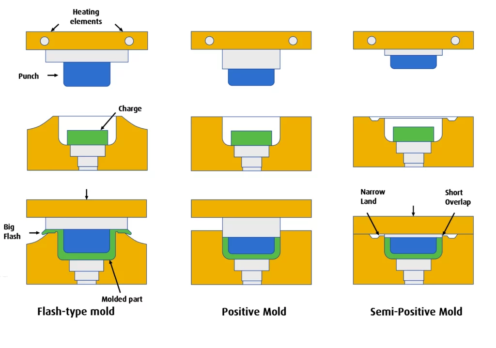 Semi-Positive Mold: Semi-positive molds offer a compromise. They allow limited, controlled flash to escape into overflow grooves, making them more flexible than positive molds, while still delivering a cleaner finish than flash molds. They are a solid choice for medium-volume production when a cleaner part is needed, but without the cost or rigidity of fully enclosed tooling.