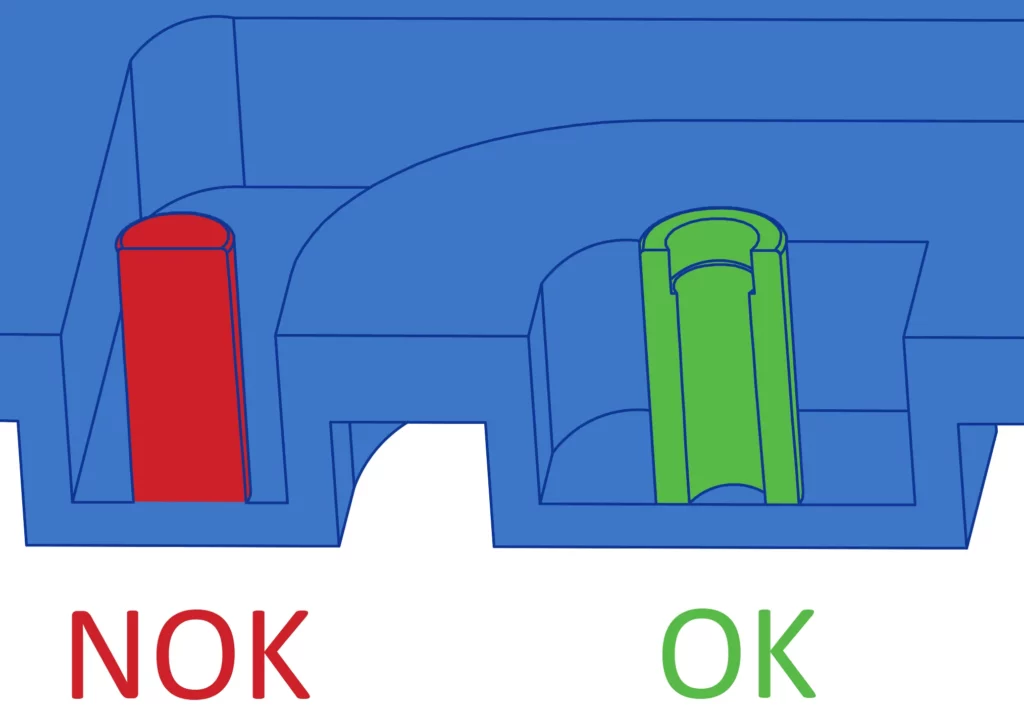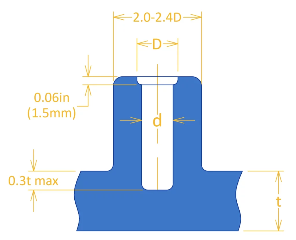 Bosses are vertical elements that serve as assembly points and enhance the structural integrity of a part, often used for fasteners like screws. Here’s our guidance for designing bosses: